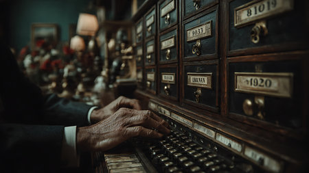 Explore a vintage wooden drawer brimming with old paper files and cards, revealing the charm of historic records in a rustic office atmosphere.
