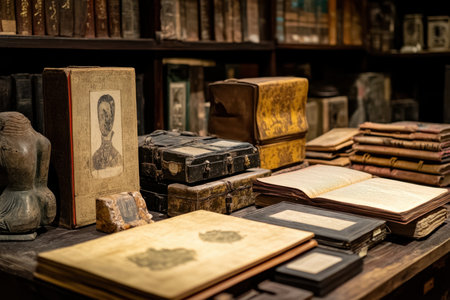 Old vintage photos on an antique table, surrounded by books, evoke nostalgia and timelessness for antique lovers.