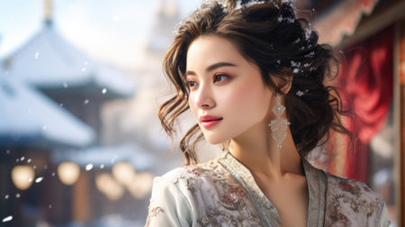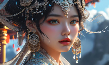 An AI generated illustration of a beautiful Chinese woman wearing vibrant traditional costume