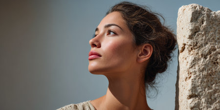 A woman is near a rough stone wall. She looks up while sunlight shines on her face. Her hair is pulled back, and she appears to be deep in thought. The background is blurred.