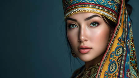 A stunning Kazakh woman adorned in a vibrant traditional costume. AI Generative