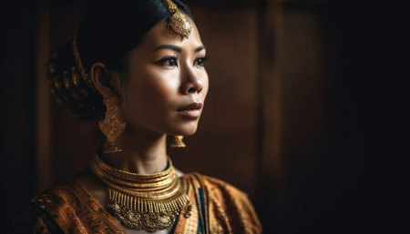 A gorgeous woman with expensive jewelry and detailed traditional clothing, her calm and collected attitude highlighting the beauty and richness of cultural history.