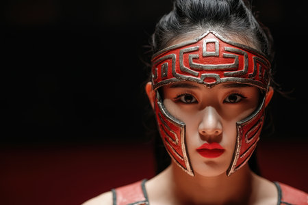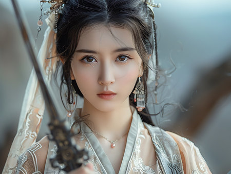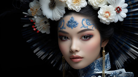 This striking portrait showcases a traditional Asian beauty with intricate makeup and floral accessories, captured in soft, dramatic light, radiating elegance.