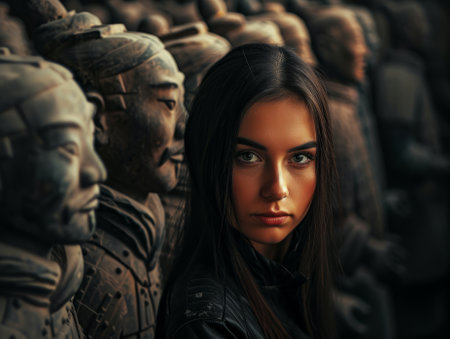 Portrait of a beautiful girl with black hair in a dark room with ancient statues