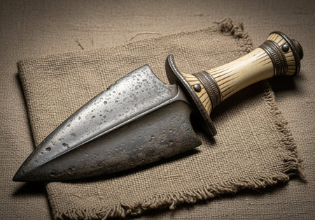 This close-up reveals a ritual dagger of an ancient mountain civilization, showing its intricately carved handle depicting storms and a blade glistening with obsidian inlays.