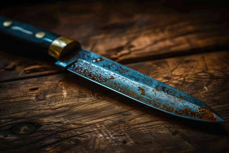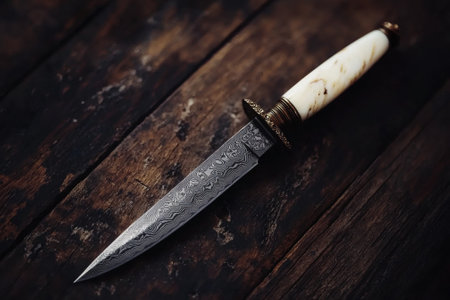 A beautifully crafted knife with a detailed blade and a polished handle lies on a dark, aged wooden table. The intricate patterns on the blade catch the light, showcasing craftsmanship.
