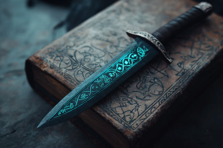 A beautifully crafted dagger with glowing etchings lies atop an ancient, weathered tome. The dark wood and mystical inscriptions create an enchanting atmosphere, hinting at forgotten tales.