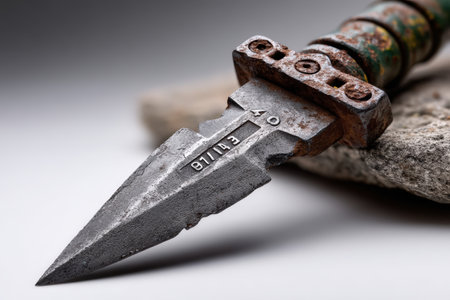 Close-up of a weathered spearhead resting on a stone, highlighting its rusted details and craftsmanship.