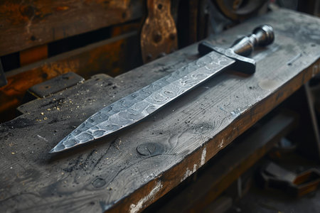 Hand forged damascus steel sword with a beautiful pattern is resting on a workbench