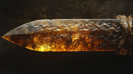 A beautifully crafted dagger with glowing engravings lies atop an aged book, highlighting remarkable artistry and a sense of timeless mystery in a dimly lit environment.