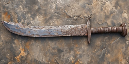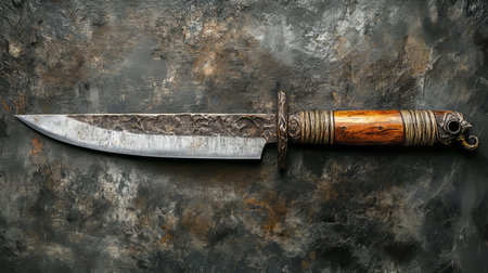 A traditional dagger with intricate designs rests on a textured stone surface highlighting its craftsmanship and material.