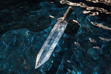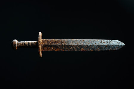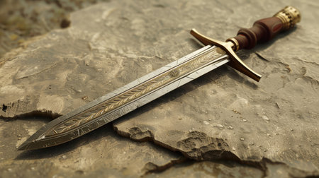 Ornate medieval fantasy sword lying on a dark stone surface, evoking themes of history, battles, and ancient legends