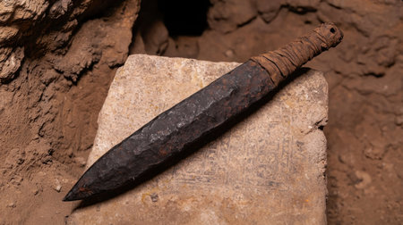 An ancient stone blade artifact rests on a rugged rock surface, showcasing unique craftsmanship and historical significance in human evolution and culture.
