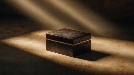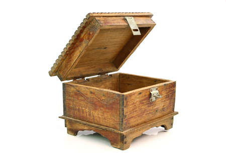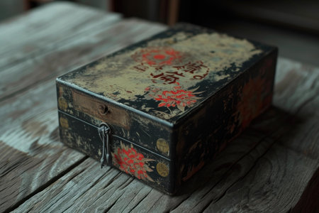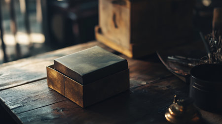 A weathered wooden box placed on a rustic tabletop with subtle natural lighting, exuding a sense of history and charm.