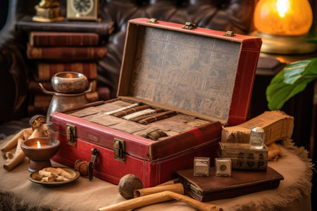 A vintage treasure chest surrounded by nostalgic items in warm lighting, evoking a sense of history and charm.