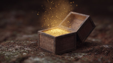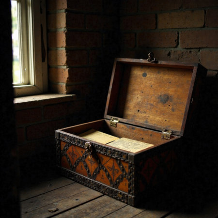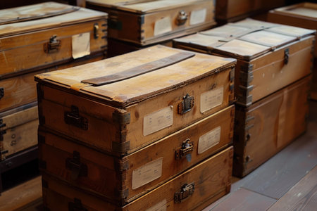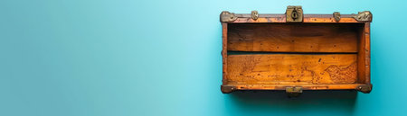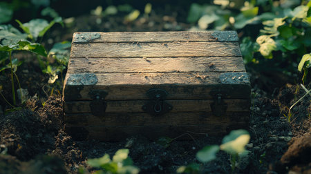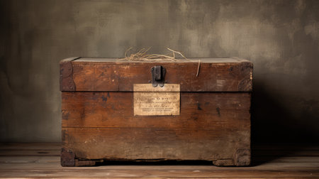 A beautifully aged wooden trunk with metal accents, showcased in a rustic environment with weathered textures, reflecting historical charm.