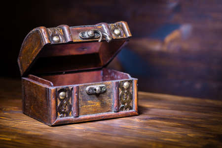 beautiful retro chest with open lid on wooden background with place for text, closeup