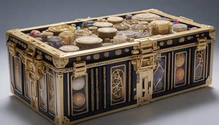 The image features a luxurious chest adorned with intricate gold detailing and filled with various ornate containers. The chest has a sophisticated design with elaborate patterns, showcasing a high level of craftsmanship. Each container inside the chest appears to be unique, with different colors and textures, indicating a collection of valuable items or artifacts. The color palette predominantly includes gold, black, and hints of blue, contributing to a regal and opulent appearance. The lock mechanism of the chest is also highly detailed, suggesting functionality along with decorative elements. This composition creates an overall sense of elegance and exclusivity, likely appealing to collectors or connoisseurs of fine objects.