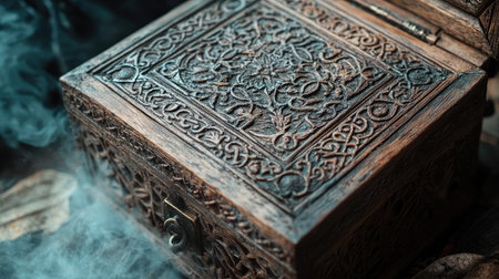 This photo showcases an intricately carved wooden box with a vintage design, surrounded by a soft smoky background, evoking a sense of mystery and elegance.