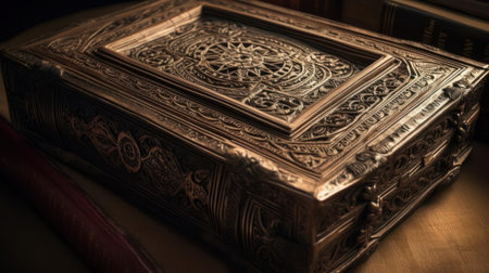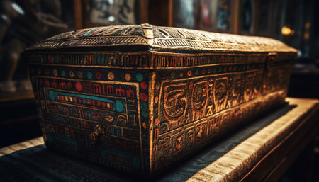 Ancient wood coffin with ornate gold decoration symbolizes spirituality generated by artificial intelligence