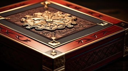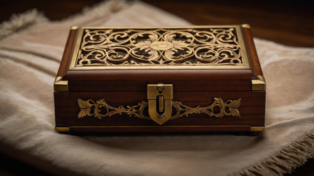 Closed wooden box with brass inlay and decorations, evoking elegance and craftsmanship