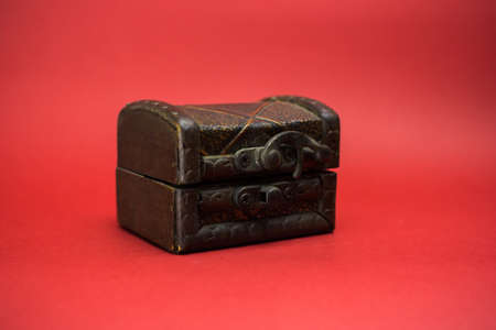 A dark wooden treasure chest with lid closed on wooden table. Selective focus
