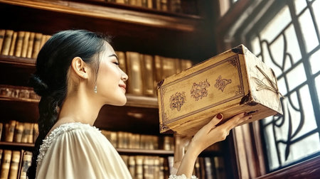An old, dusty box on a bookshelf, emitting mysterious smoke into a library setting