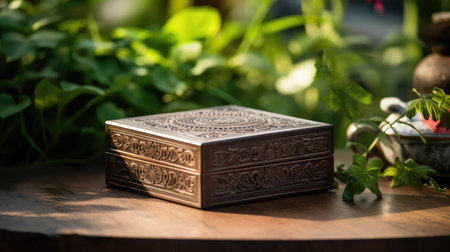 A still life photo of a book with its intricate details and decorative cover visible created with Generative AI