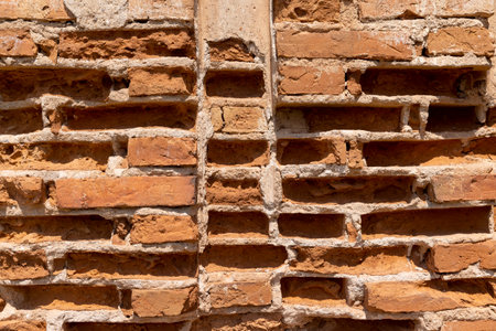 Detailed close-up of a weathered red brick wall with visible mortar, showing rustic textures and urban architectural charm.
