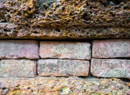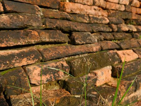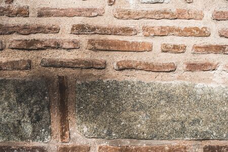 Ancient brick wall with a newly brick for repairing at Ayutthaya Historical Park, Thailand.