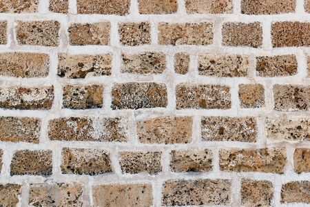 Home decoration concept and abstract background.Many brown brick blocks with white cement. Closeup view of brick blocks wall. The wall texture and background for wall design. Texture of brown brick blocks wall and copy space.