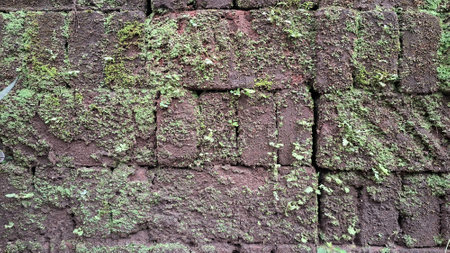 Unique organic texture formed by green moss growing on the surface of aged bricks, ideal for backgrounds needing a natural and time-worn feel