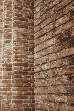 Side angle of a red brick wall corner. Close up view of cracked weathered brickwork material. Modern interior design, unique perspective. Loft like room style at home. Rusty facade architecture.