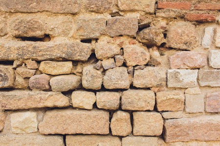 The texture of the wall of old brick with dense masonry interspersed with stone
