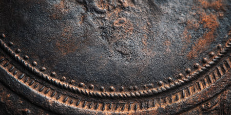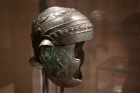 Leiden, The Netherlands - JAN 04, 2020: closeup of an old visor mask from ancient Rome found in The Netherlands. Ancient Roman Empire. Made of Iron covered with bronze. Remnants of a hinge on top.