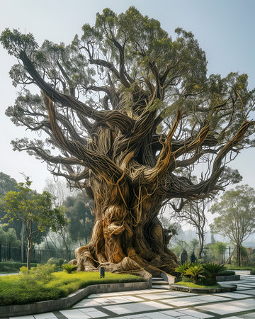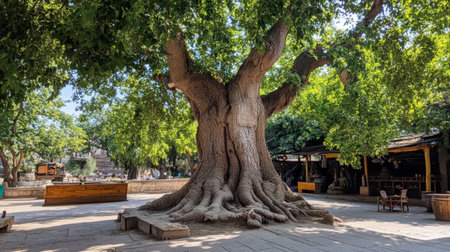 A magnificent ancient tree with expansive roots stands prominently in a serene outdoor area, surrounded by lush greenery and benches, creating a peaceful atmosphere.
