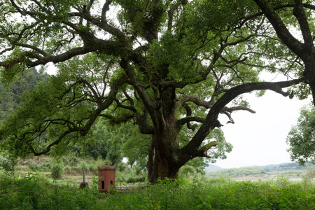 Ancient Tree Silhouette, Surrounded by Verdant Hills and Traditional Oriental Architecture