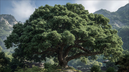 An ancient, towering tree with sprawling branches stands resilient amid vibrant foliage, sunlight filtering through leaves, creating a serene, timeless atmosphere.