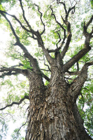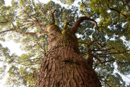 The sun coming through the crown of ancient camphor tree (Cinnamomum camphora) at the Imperial Palace garden. Tokyo. Japan