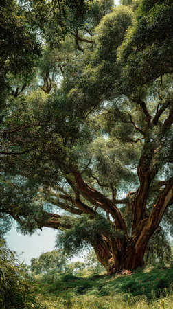 An upward view of a majestic, ancient tree with thick, gnarled branches stretching out, covered in lush green leaves, creating a canopy against the sky.