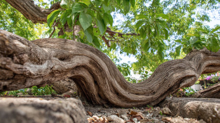 This captivating image showcases the winding roots of a tree, elegantly twisting under a lush green canopy, illuminated by sunlight. The scene evokes tranquility and harmony with nature.