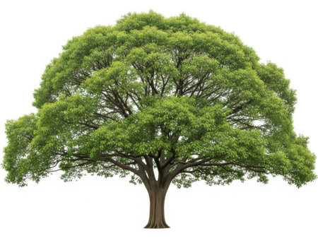 A large, lush tree with a broad, dense canopy of vibrant green leaves, standing tall and proud against a clear sky.