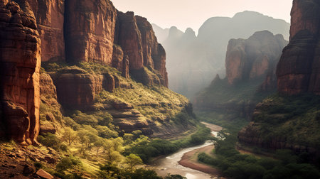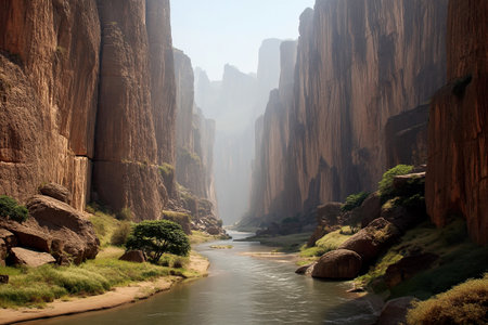 AI Generated. Majestic river flows through a rocky gorge surrounded by towering cliffs and lush greenery in the early morning light