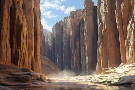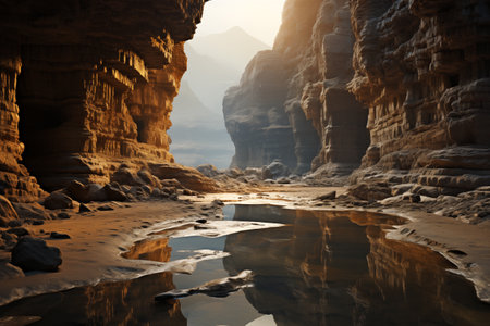 AI Generated. Majestic canyon landscape with sunlight filtering through rocky cliffs at midday