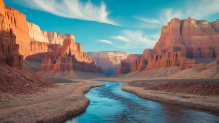 AI Generated. Majestic Canyon Landscape with Serene River and Stunning Rock Formations Under Bright Blue Sky