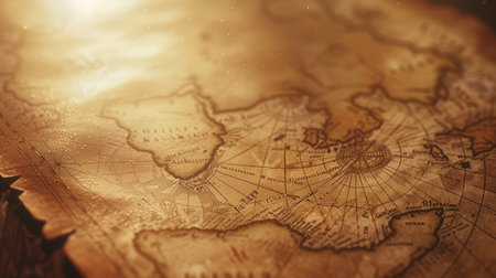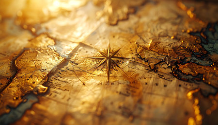 A warm, golden light illuminates a weathered, antique map, highlighting a compass rose at its center. This image evokes a sense of grand adventure, historical discovery, and the start of an epic journey towards a hidden treasure or a long-lost destination.
