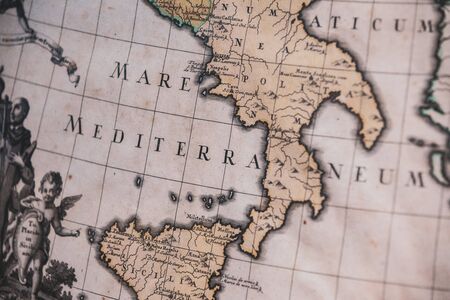 Ancient map of the Mediterranean Sea of Italy. Ancient Latin language, Italian peninsula. Selective focus. Inside the monastery of Montecassino in Italy.