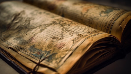 Ancient Bible, stained and torn, still holds wisdom generated by artificial intelligence