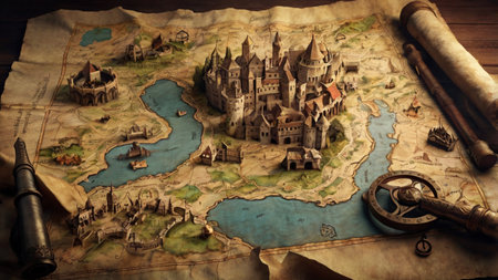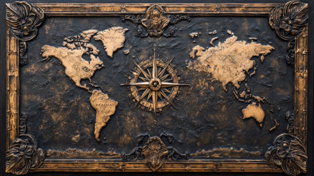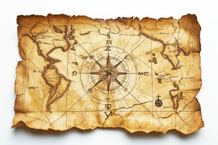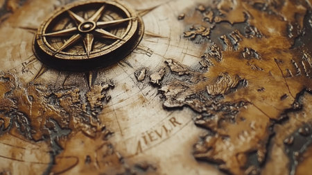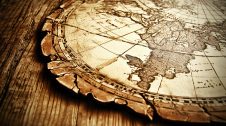 Antique world map, engraved on stained paper, guides exploration journey generated by artificial intelligence