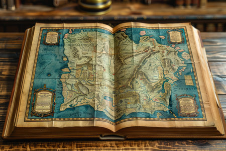 Open Antique Book with a Hand-Drawn Map of a Fictional Land